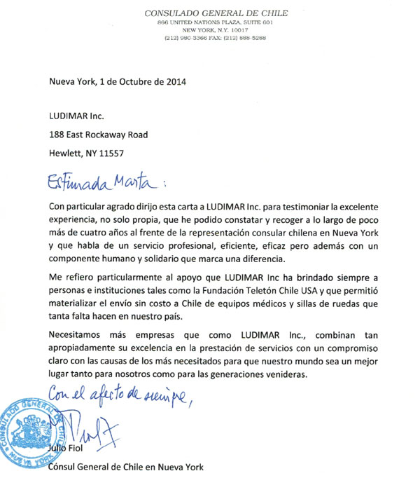 Ludimar Inc. es una empresa con licencia de Freight Forwarder del Servicio de Aduanas de Chile. Esto permite que la empresa ofrezca un servicio asegurado por compañías tanto en los lugares de origen como en sus destinos. Basado en esto es que Ludimar garantiza su envío desde el momento que esta en posesión de su carga en USA. hasta que llega al destinatario que el cliente indique en Chile .